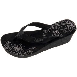 We like floral prints. Based on the Zelda with floral embossing. A 2 1/2-inch platform sandal with a padded footbed and lined strap.